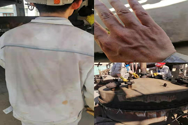 大家都知道轉(zhuǎn)化現(xiàn)場溫度很高,而且近期外界氣溫已高達(dá)三十七八度。轉(zhuǎn)化現(xiàn)場溫度都接近于45度左右,如同一個(gè)大蒸籠,而轉(zhuǎn)化人員卻每天都在這個(gè)大蒸籠里工作;每每投甩完一臺(tái)轉(zhuǎn)化器后,衣服已全部被汗水浸透;到汗珠流到眼睛后,加之與氯化氫氣體接觸,眼睛完全睜不開;在拿掉塑膠手套的那一刻,一雙手被捂的發(fā)白發(fā)皺;如同在水里浸泡了數(shù)小時(shí)一樣,但是就在這樣的工作環(huán)境下,卻沒有一個(gè)人退縮,都在堅(jiān)守著自己的工作崗位,做出最大的奉獻(xiàn)。