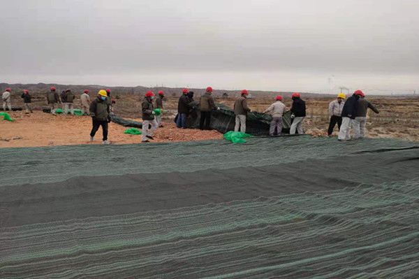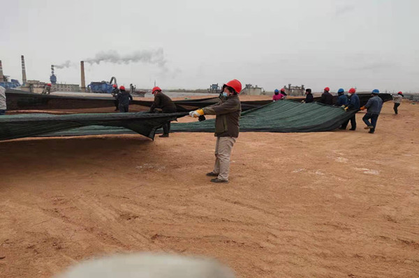由于公司電石泥堆場地更換為新原料堆場造成的部分土地裸露,造成揚(yáng)塵污染,治風(fēng)沙、阻揚(yáng)塵這項(xiàng)工作迫在眉睫;初冬的天氣冷風(fēng)呼啦啦掃動著滿地的枯葉紙屑,濃黑的云像一團(tuán)團(tuán)破絮,倒懸在我們的上空,北風(fēng)呼呼那個(gè)吹,任憑它的怎么肆虐卻擊退不了職工們工作的熱情,瞧他們單膝蓋在潮濕的泥土上細(xì)心的用鐵絲鏈接著每個(gè)接口。男職工展現(xiàn)大力水手的魅力,兩人一卷,一人一卷有序的擺放在裸露的土地中央,女同事也不甘示弱拆開整卷防塵網(wǎng)整齊的鋪在砂石頂部,大家喊著整齊的口號,經(jīng)過一早上不懈努力,就將整個(gè)原料場地覆蓋完畢。既抑制滿天風(fēng)沙的場景,也保存了大量的原料被風(fēng)帶走,造成原料損耗。