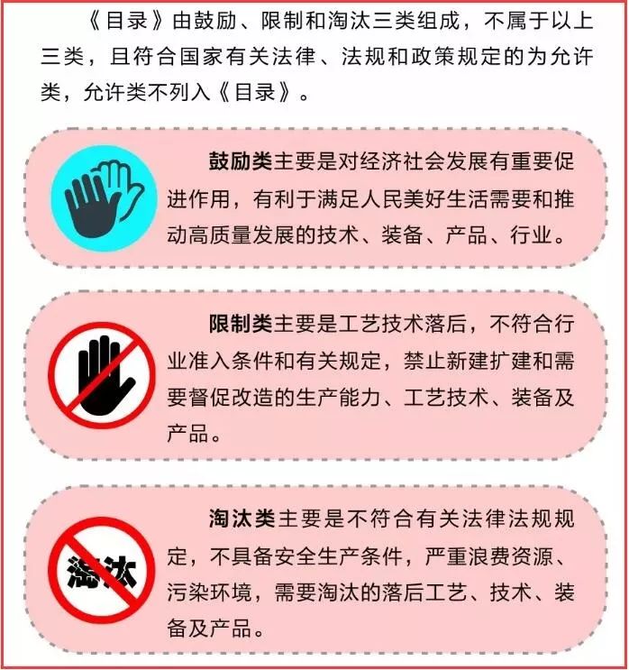 目錄(2019年本)共涉及行業(yè)48個,條目1477條,其中鼓勵類821條、限制類215條、淘汰類441條。不屬于以上三類,且符合國家有關(guān)法律、法規(guī)和政策規(guī)定的為允許類,不列入《目錄》。