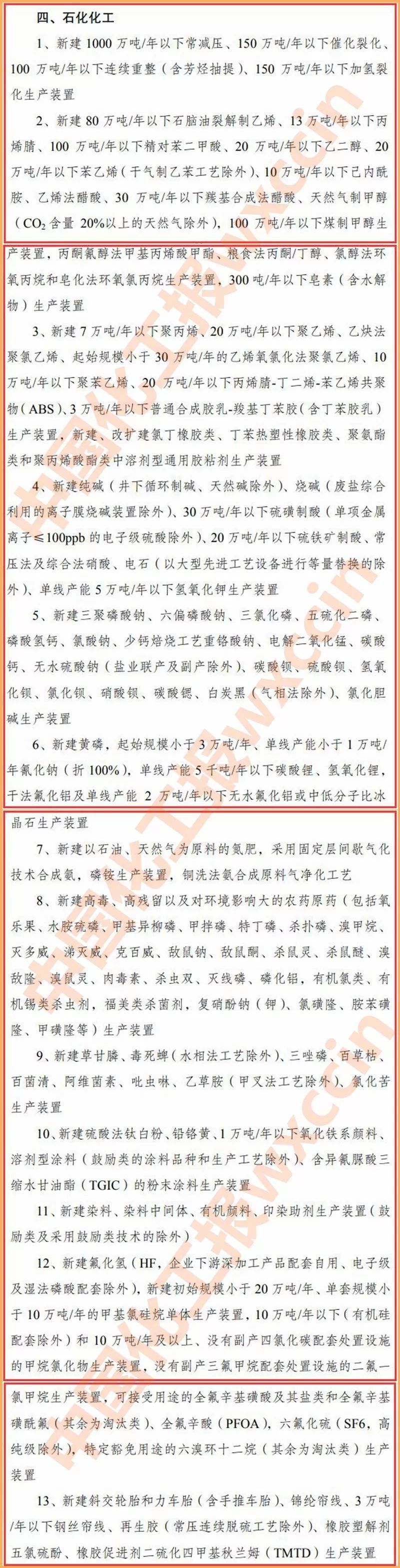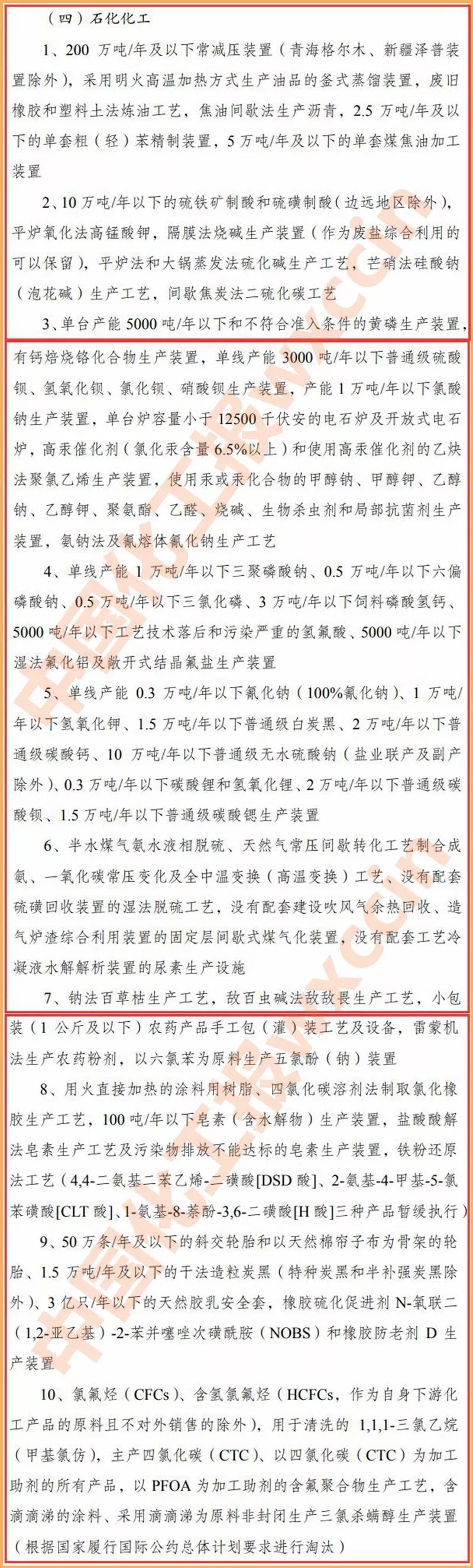 石化化工行業(yè)淘汰類有10大類,比征求意見稿少了2大類,包括:200 萬噸/年及以下常減壓裝置,2.5 萬噸/年及以下的單套粗(輕)苯精制裝置,5 萬噸/年及以下的單套煤焦油加工裝置;單臺產(chǎn)能 5000 噸/年以下黃磷生產(chǎn)裝置;半水煤氣氨水液相脫硫、天然氣常壓間歇轉(zhuǎn)化工藝制合成氨、一氧化碳常壓變化及全中溫變換(高溫變換)工藝、沒有配套硫磺回收裝置的濕法脫硫工藝,沒有配套建設(shè)吹風氣余熱回收、造氣爐渣綜合利用裝置的固定層間歇式煤氣化裝置,沒有配套工藝冷凝液水解解析裝置的尿素生產(chǎn)設(shè)施;鈉法百草枯生產(chǎn)工藝,敵百蟲堿法敵敵畏生產(chǎn)工藝,雷蒙機法生產(chǎn)農(nóng)藥粉劑,以六氯苯為原料生產(chǎn)五氯酚(鈉)裝置等。