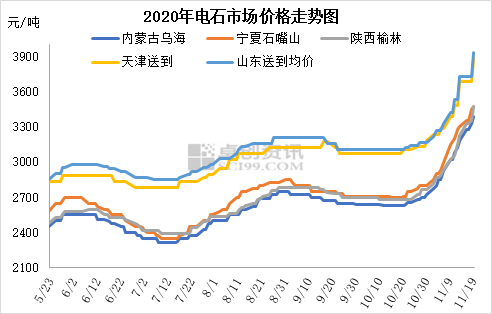 整體市場描述:上周五至今電石價格繼續(xù)快速上漲,各地采購價連續(xù)上調300-400元/噸,電石出廠價上調200元/噸左右,且烏海及周邊貿(mào)易出廠價推出了明日繼續(xù)上漲100元/噸計劃。至此,10月下旬至今,電石價格已連續(xù)上調了700-800元/噸,達到2011年9月以來的最高水平。本周電石價格仍在繼續(xù)上調,主要仍因供需失衡,貨源緊俏推動。內蒙古地區(qū)電石仍頻繁有不同程度的限電現(xiàn)象,產(chǎn)量不足,寧夏石嘴山地區(qū)受重污染天氣影響,本周后期有電石爐降負荷現(xiàn)象,外加其它復工電石爐恢復緩慢,電石增量較為有限;但PVC價格仍在連續(xù)上漲,前期停車PVC企業(yè)也有復產(chǎn),整體開工高位,部分甚至超負荷運行,外加冬季來臨前對電石也有補庫需求,整體需求維持高位,綜合導致電石貨源持續(xù)緊張,價格得以連續(xù)上揚。