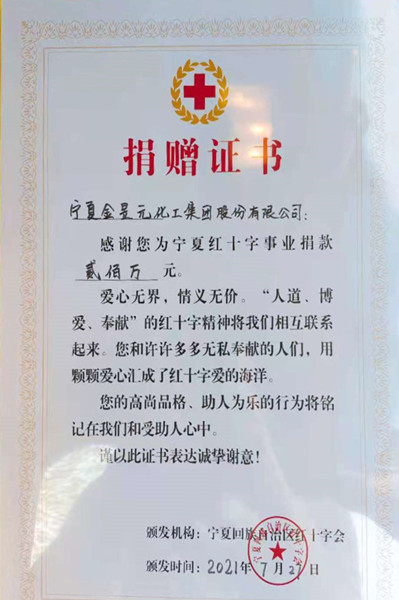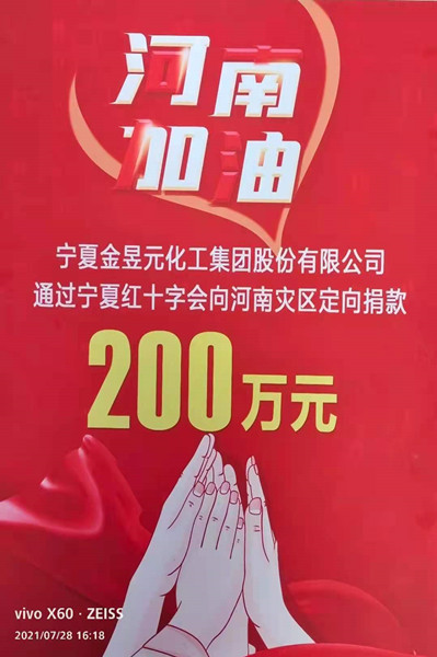 洪災無情,人間有愛。7月28日,寧夏金昱元化工集團股份有限公司委托寧夏紅十字會向河南災區(qū)捐助二百萬元,馳援河南受災地區(qū),表達對災區(qū)人民的深切問候。