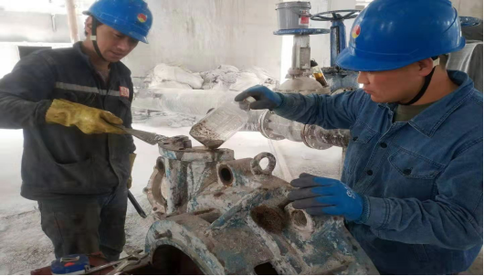 穿過馬路,步入公司核心生產(chǎn)區(qū)域。在生料裝置各個現(xiàn)場,1#號濃縮池底安裝渣漿泵,1#-16#刮板機下料口技改、堆料機1502皮帶硫化、循環(huán)風機、尾排風機、V選、混料機、輥壓機檢修的完成以及1102皮帶托輥檢查及軸承潤滑的進行。此時,在酷暑下,一個個精神充沛的工友們頂著烈日的酷曬,正聚精會神的進行著檢修作業(yè),他一只手扶著設(shè)備,一只手使勁的搬動著板子,那動作仿佛撫摸初生嬰兒的笑臉,那種眼神好似在說:孩子,你快成型了,等你成型組裝后,就會被帶動其他設(shè)備和諧運轉(zhuǎn)。他們是設(shè)備正常運轉(zhuǎn)的一個個信使,傳遞著安全生產(chǎn),減輕勞動強度,促進人們對公司健康發(fā)展的美好祝愿。