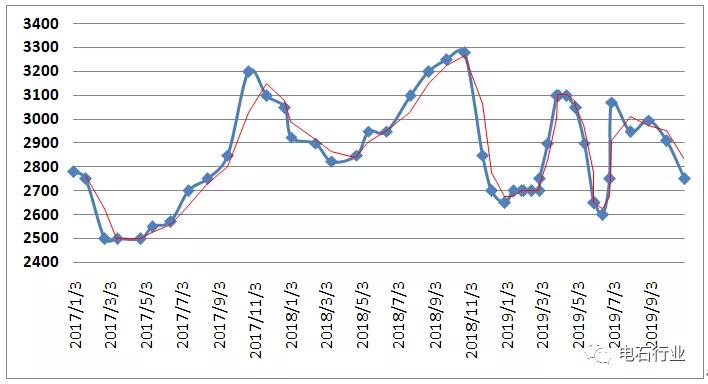 2019年電石市場波動不同于2018年,價格出現了連續(xù)快速的波動,漲跌幾乎無任何喘息時間,主要受到供需持續(xù)波動的影響。前半年經歷大幅漲跌,上漲時連續(xù)大漲,漲幅超過600元/噸,下跌時快速下移,降幅跌破成本線后再度下行400元/噸,回吐了全部漲幅;三季度電石價格呈現“N”字型走勢,先漲后跌再漲,變化幅度略小于上半年:7月價格前漲后穩(wěn)月底局部小幅下調,多數時間慣性上漲200-300元/噸,隨后月底局部價格下調50元/噸左右;8月份價格下行200-300元/噸,回吐前期漲幅;9月份價格再度反彈,至月底已反彈了150-250元/噸不等;10月電石價格再次極速下滑300元/噸,1-10月電石價格呈現“M”字型,回落到當前主流價格的2550-2650元/噸。
