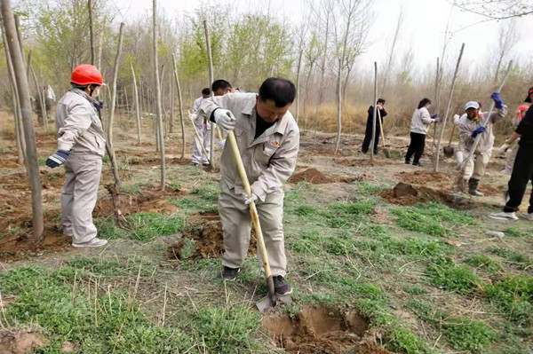 參加植樹的職工一到現(xiàn)場,便投入到火熱的工作中。大家或揮鍬挖坑,或扶苗培土,或提桶澆水,所有人齊心協(xié)力、相互配合,現(xiàn)場一片繁忙景象。